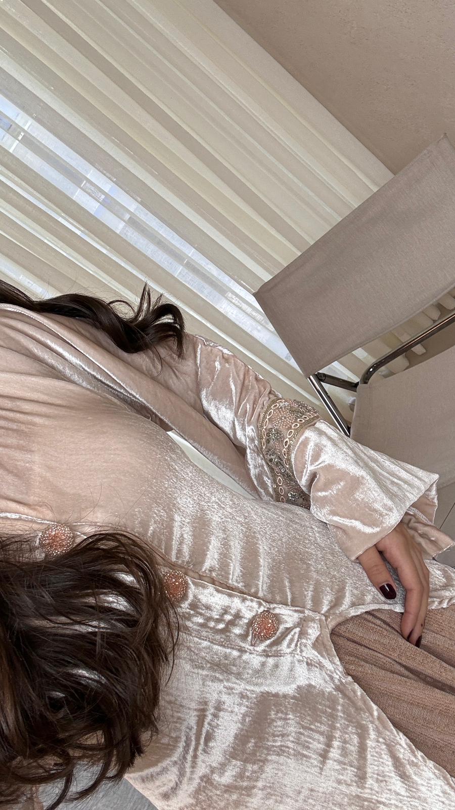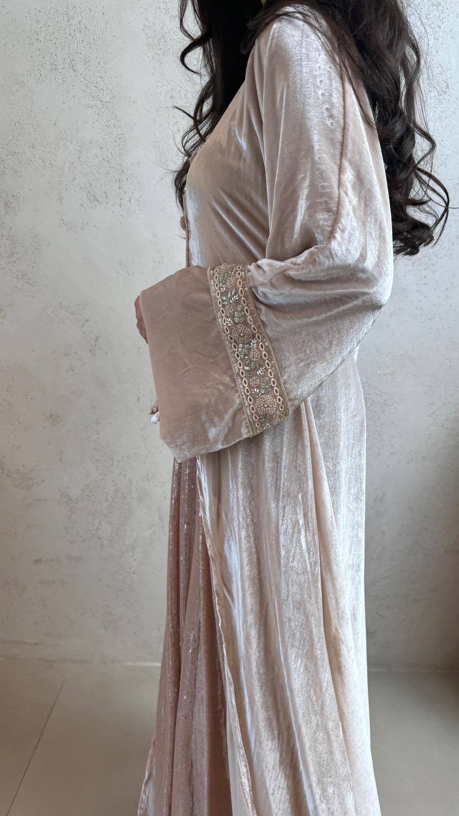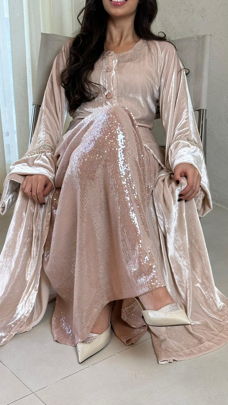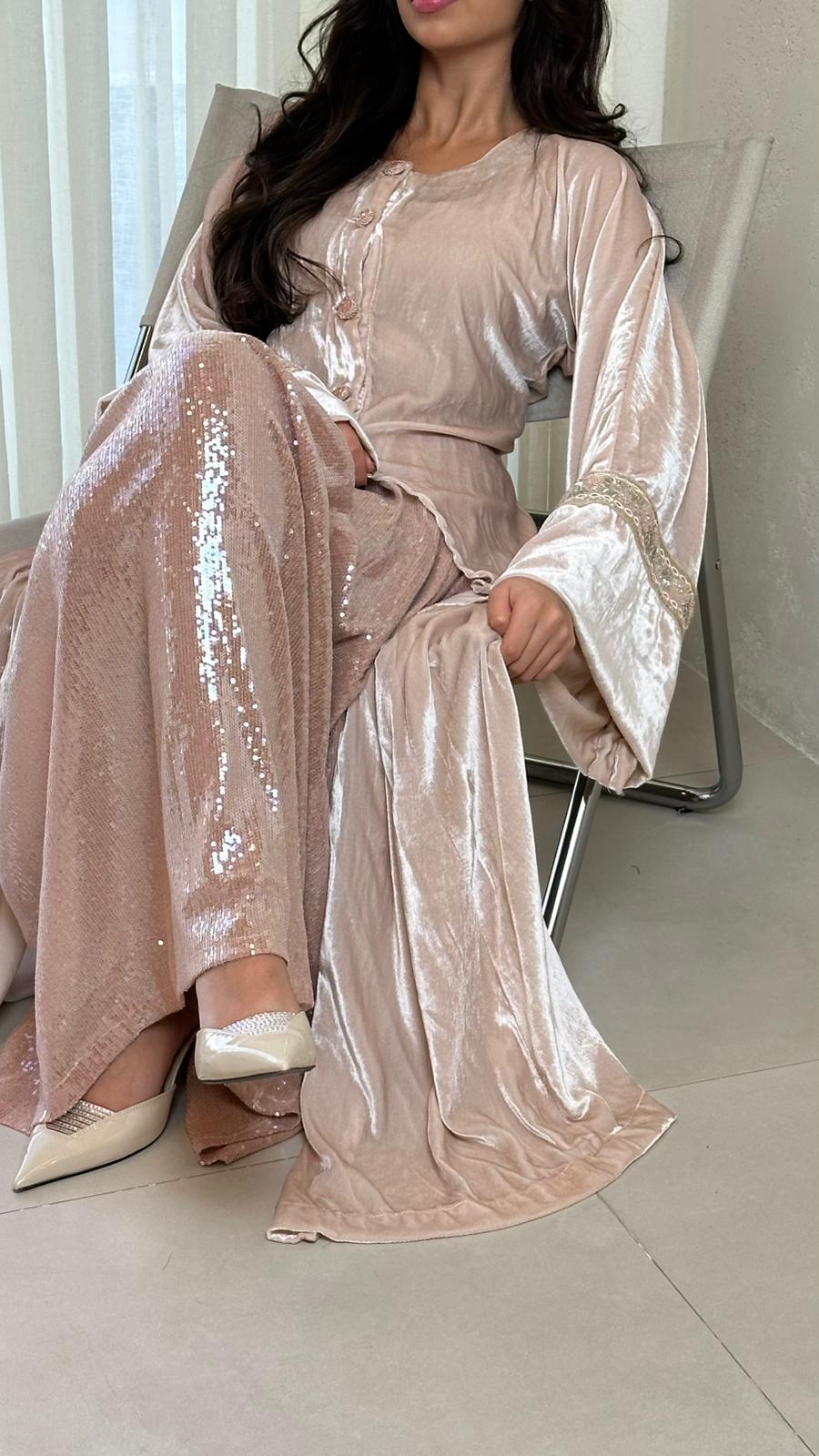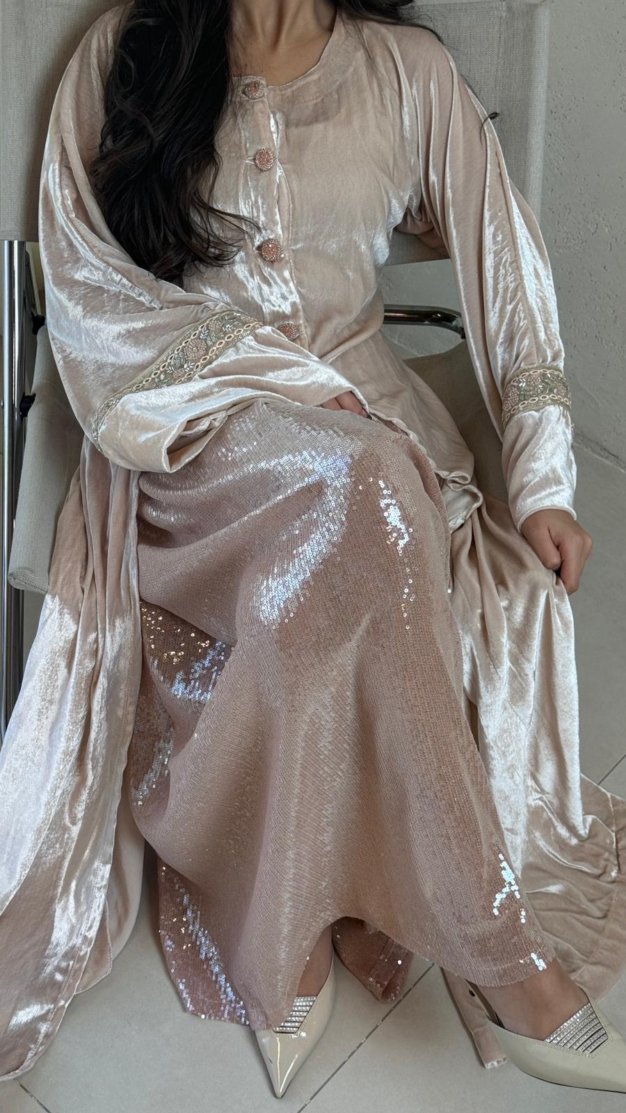 A stylish tow-piece set featuring a soft velvet top paired with a sequin skirt